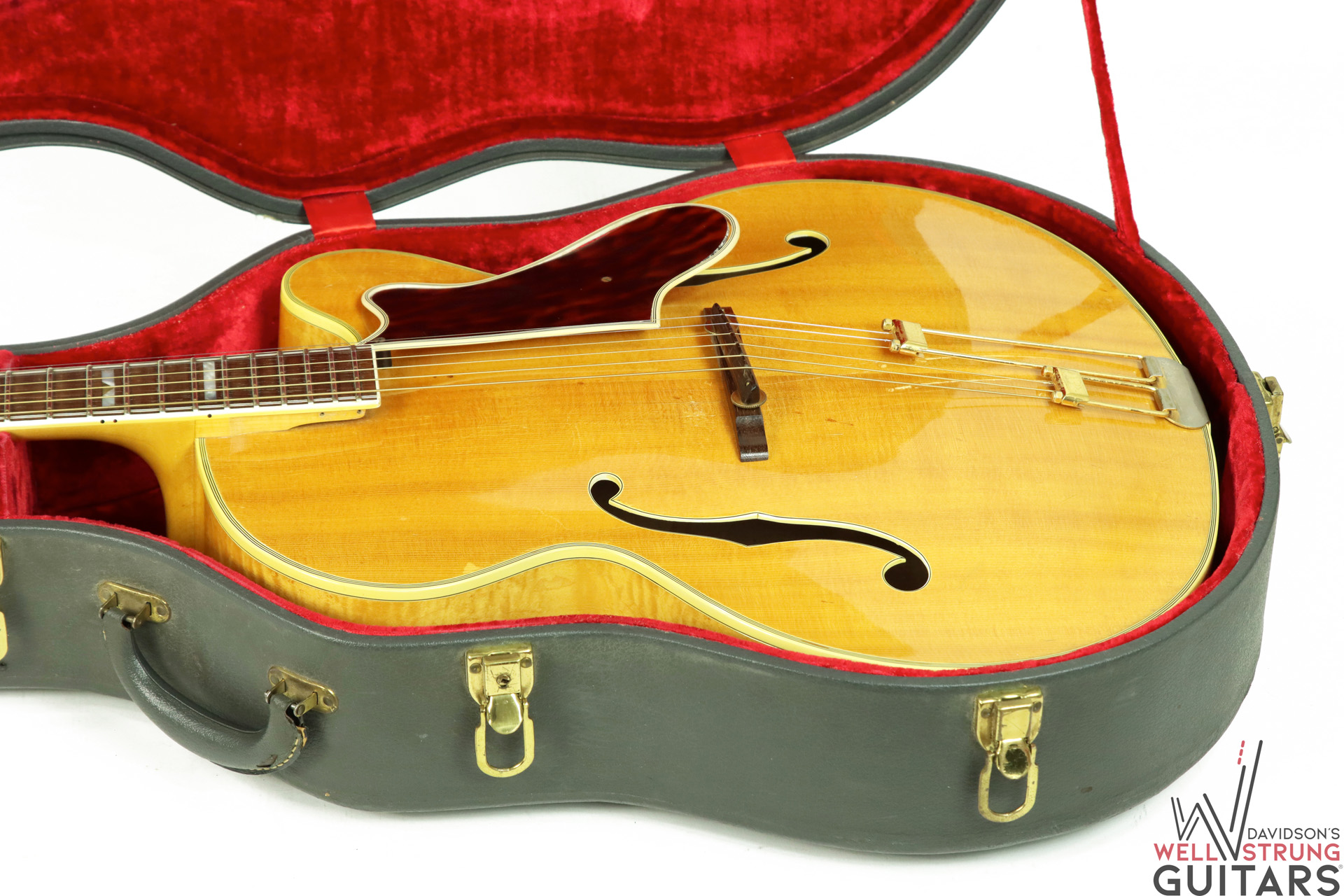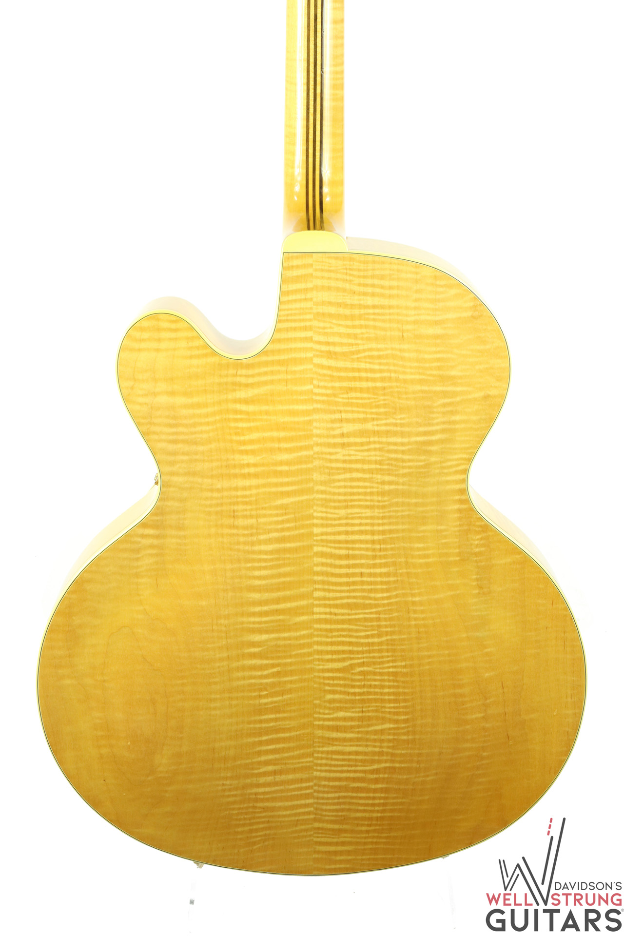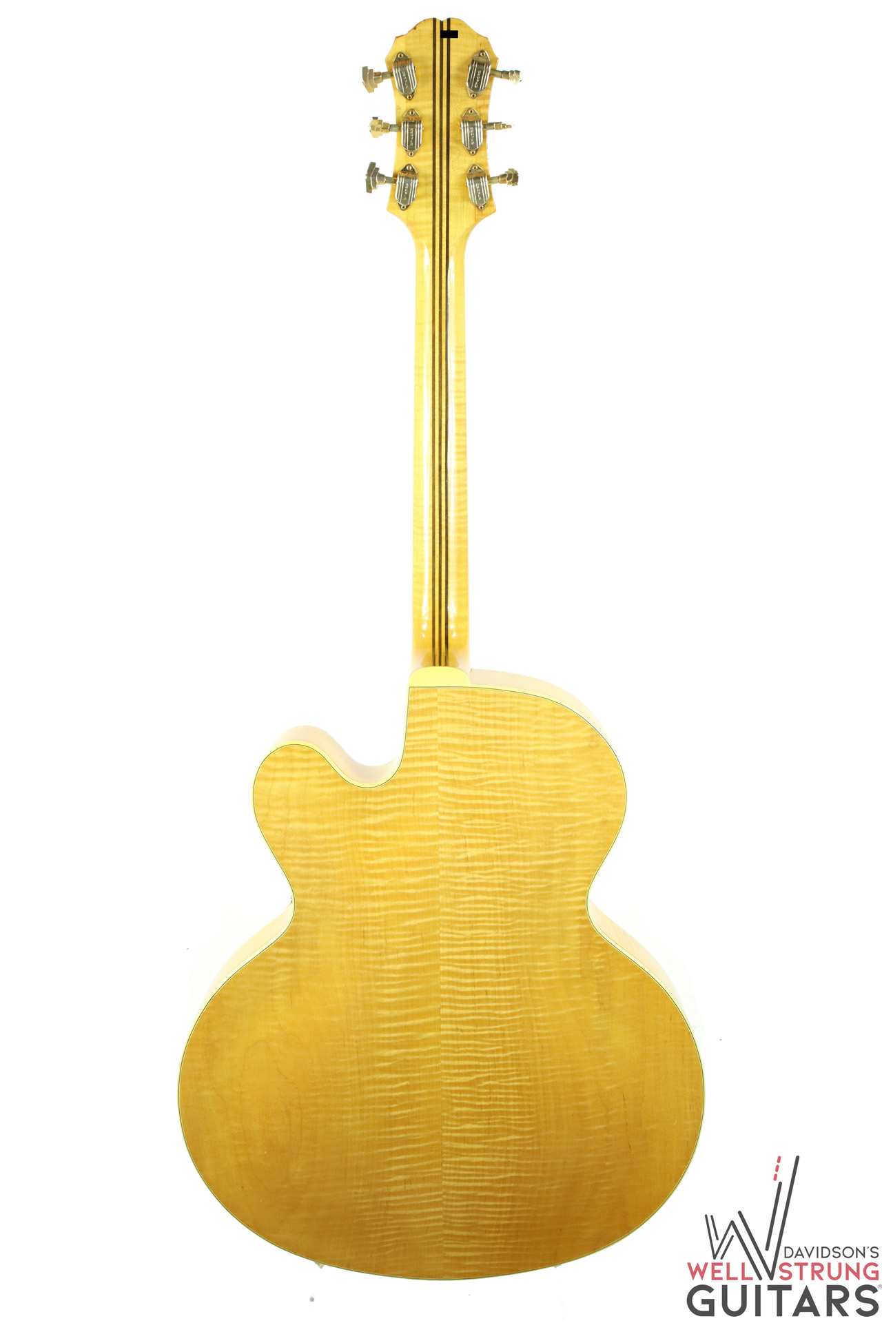 Check out this gorgeous 1963 Epiphone Emperor Regent Cutaway A112N in a Natural finish! These big-body, Kalamazoo-made Epiphone’s are getting harder and harder to come by, especially one that doesn’t break the bank. This example features an incredible flamed maple back that is one of the most beautiful pieces of maple we have ever seen. During its life, it seems someone removed the floating pickup and replaced the pickguard. However, this appears to have been done long ago. The current pickguard appears to be much older and is shrinking substantially but still functions as intended. The guitar sounds phenomenal as an acoustic and because of the oversized body, it truly is a cannon. This one features an 18″ lower bout width, 13″ upper bout width, a 1st fret neck depth of .82″, and a 9th fret neck depth of .95”. It is in great shape for being almost 60 years old showing only a few nicks and dings and a couple of finish gouges that appear to have had a light coat of finish painted over to protect them. Besides the absent pickup and replaced pickguard, this guitar appears to be completely original with no breaks or repairs.