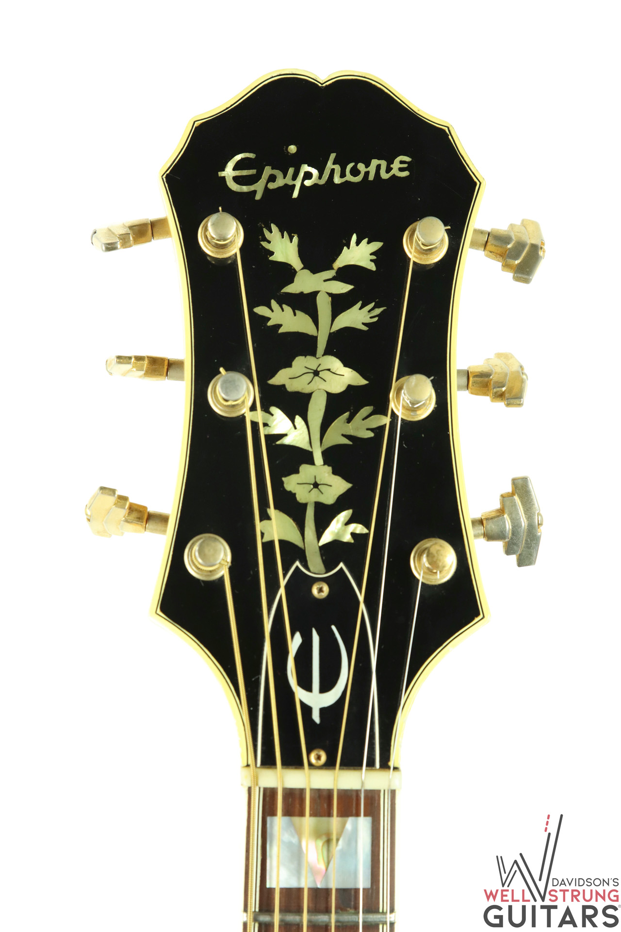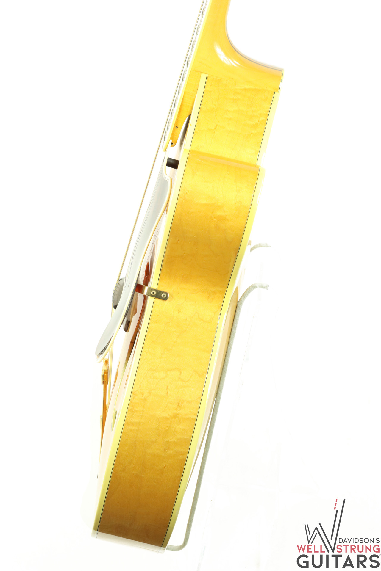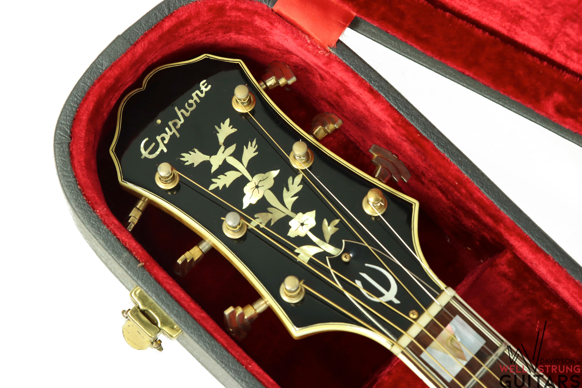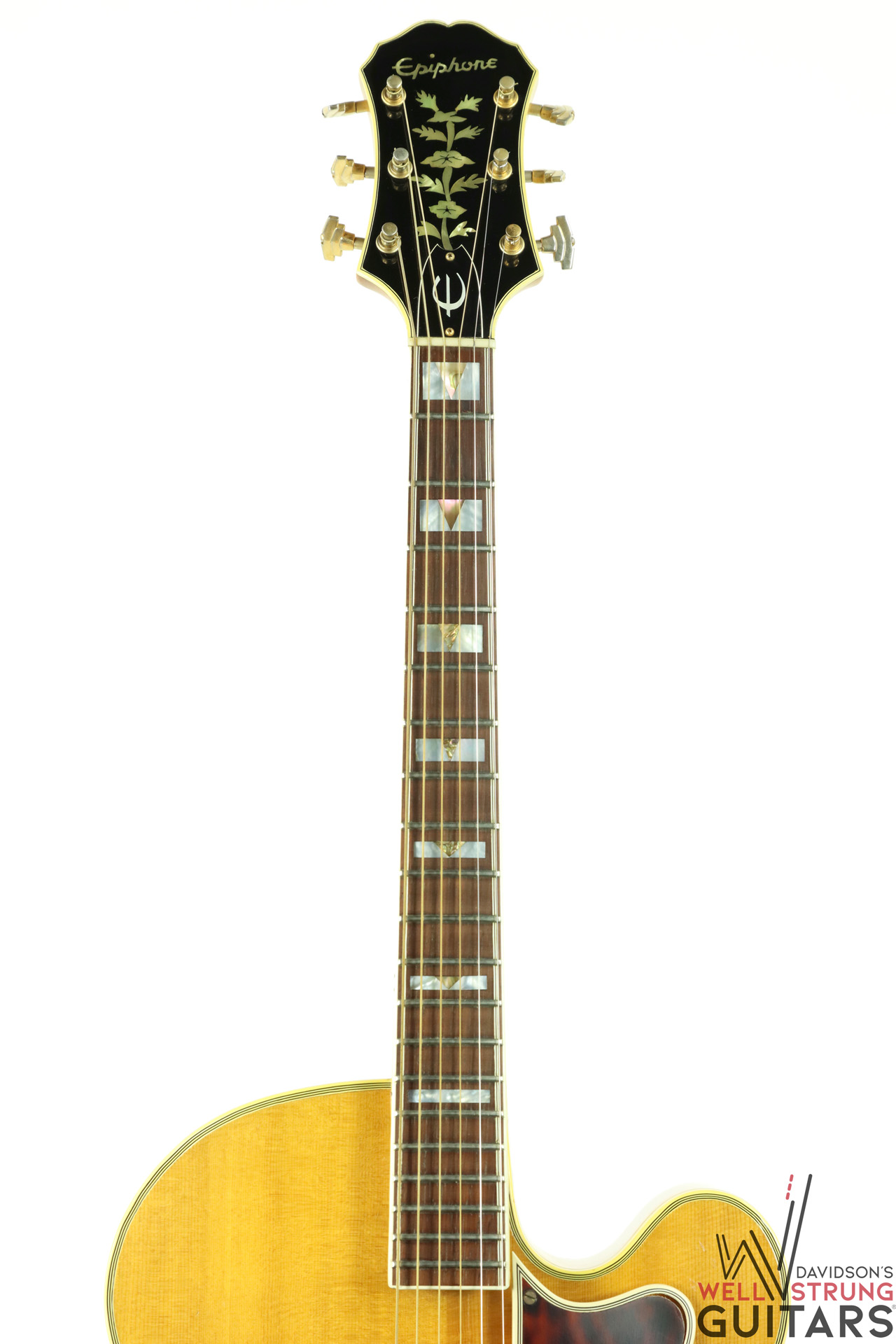 Check out this gorgeous 1963 Epiphone Emperor Regent Cutaway A112N in a Natural finish! These big-body, Kalamazoo-made Epiphone’s are getting harder and harder to come by, especially one that doesn’t break the bank. This example features an incredible flamed maple back that is one of the most beautiful pieces of maple we have ever seen. During its life, it seems someone removed the floating pickup and replaced the pickguard. However, this appears to have been done long ago. The current pickguard appears to be much older and is shrinking substantially but still functions as intended. The guitar sounds phenomenal as an acoustic and because of the oversized body, it truly is a cannon. This one features an 18″ lower bout width, 13″ upper bout width, a 1st fret neck depth of .82″, and a 9th fret neck depth of .95”. It is in great shape for being almost 60 years old showing only a few nicks and dings and a couple of finish gouges that appear to have had a light coat of finish painted over to protect them. Besides the absent pickup and replaced pickguard, this guitar appears to be completely original with no breaks or repairs.