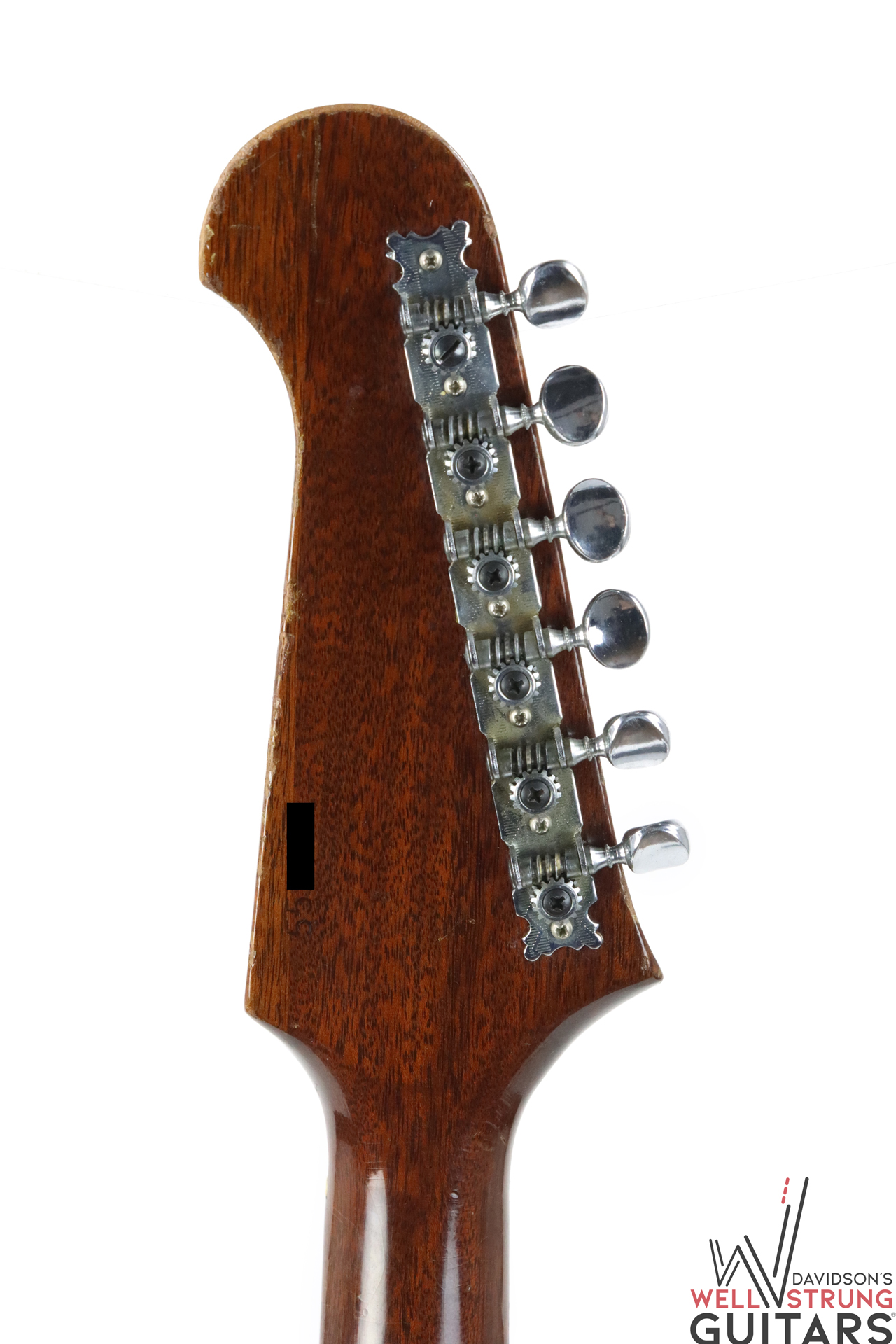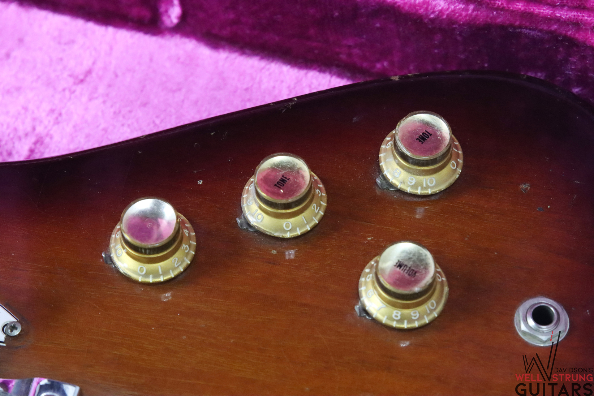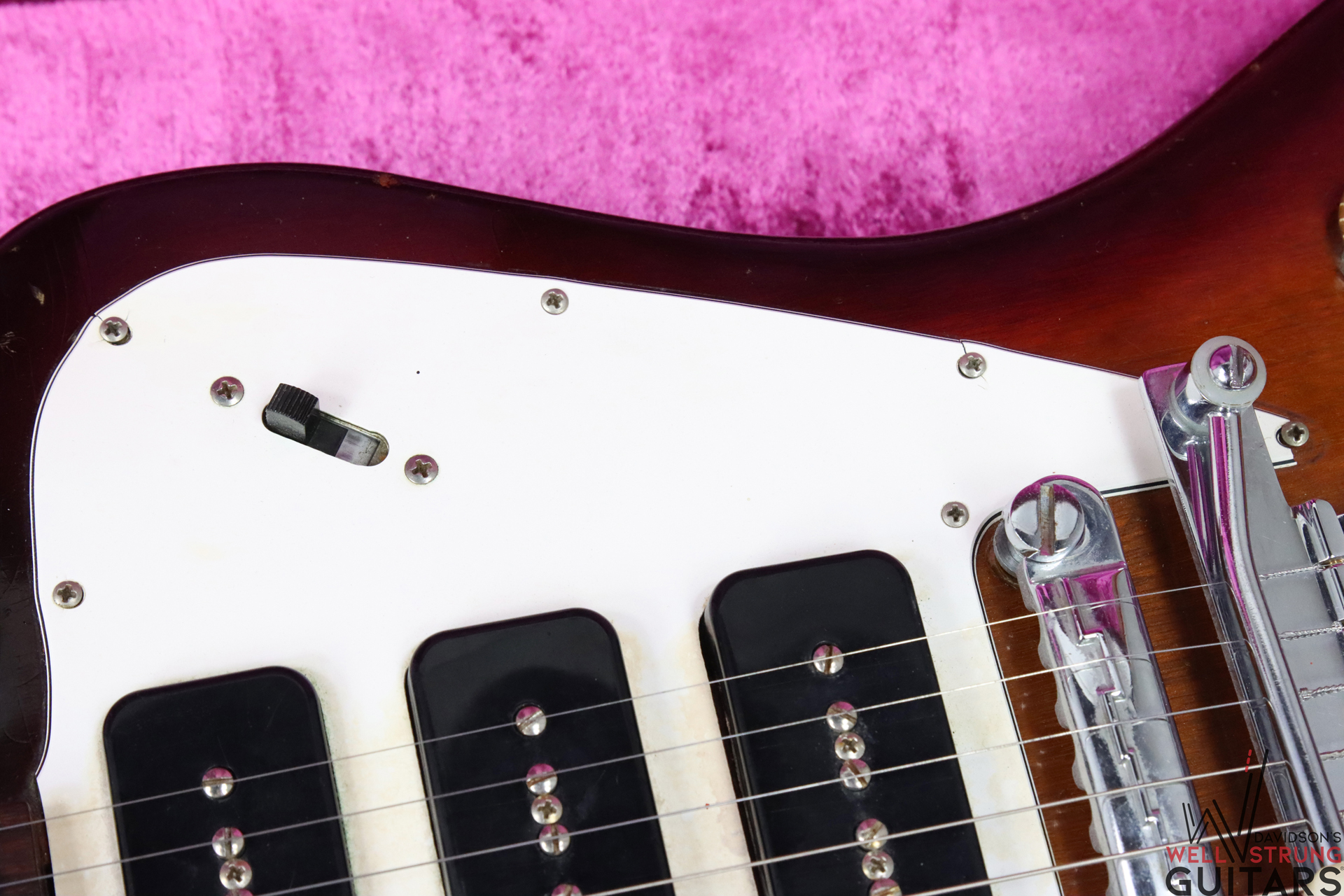 This 1966 Gibson Firebird III in Sunburst is available now! As a Non-Reverse III, it sports a trio of P-90 pickups (all pretty well-balanced), a short Maestro vibrola, and a stairstep bridge. This guitar remains original, with late 1965 pot dates, making it an early 1966 example by serial number. This one has been played in, with plenty of finish checking, nicks, and dings giving it some vibe. There are some light divots in the back of the neck, light staining on the white pickguard around the pickups, and a faded Firebird logo. The coolest feature of this guitar is actually only visible under blacklight! On the lower bass bout, someone applied a sticker or design that looks to be “Love” in script with a heart. While this is no longer visible to the naked eye, you can see the difference in finish once under blacklight. We have included a photo in the listing.