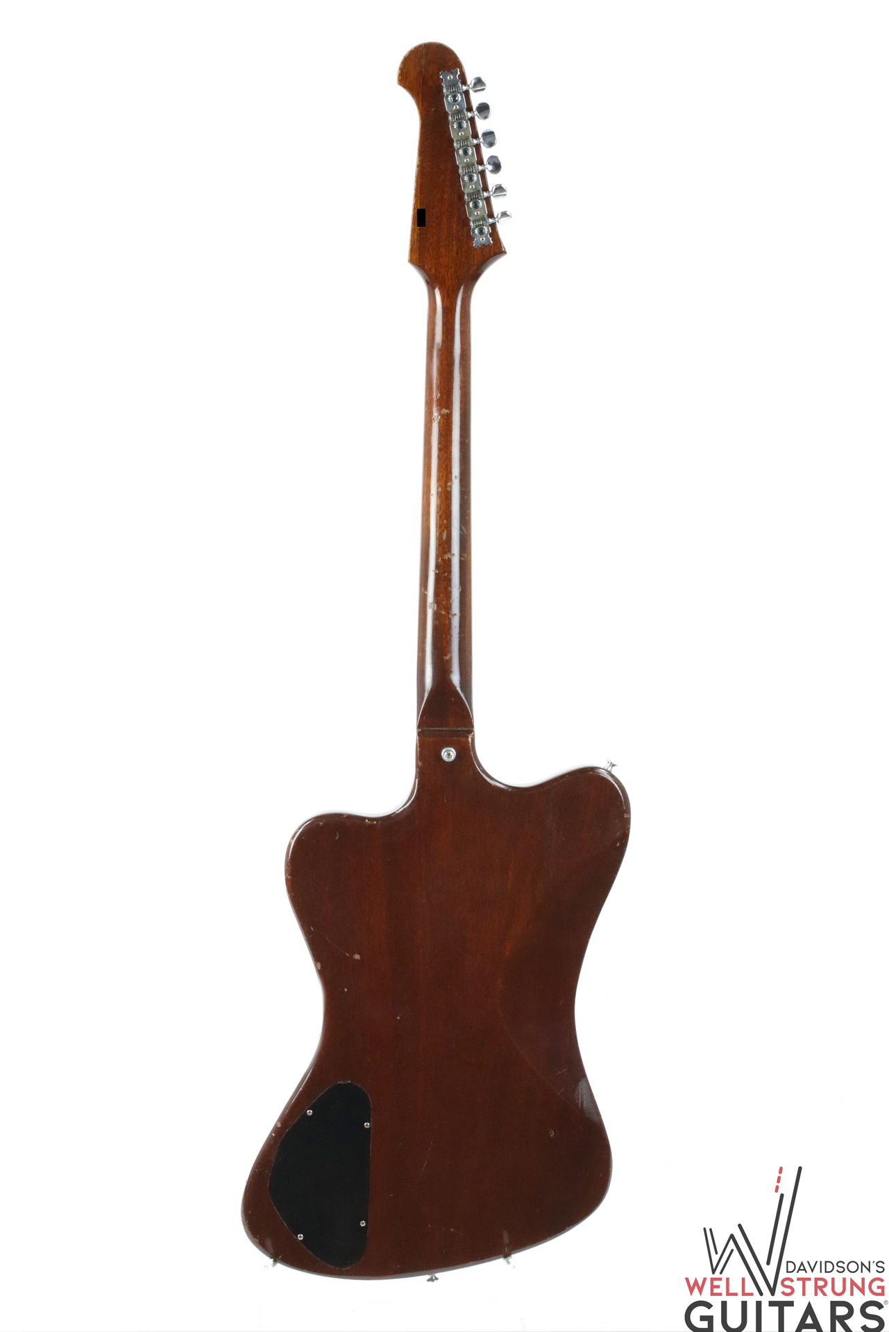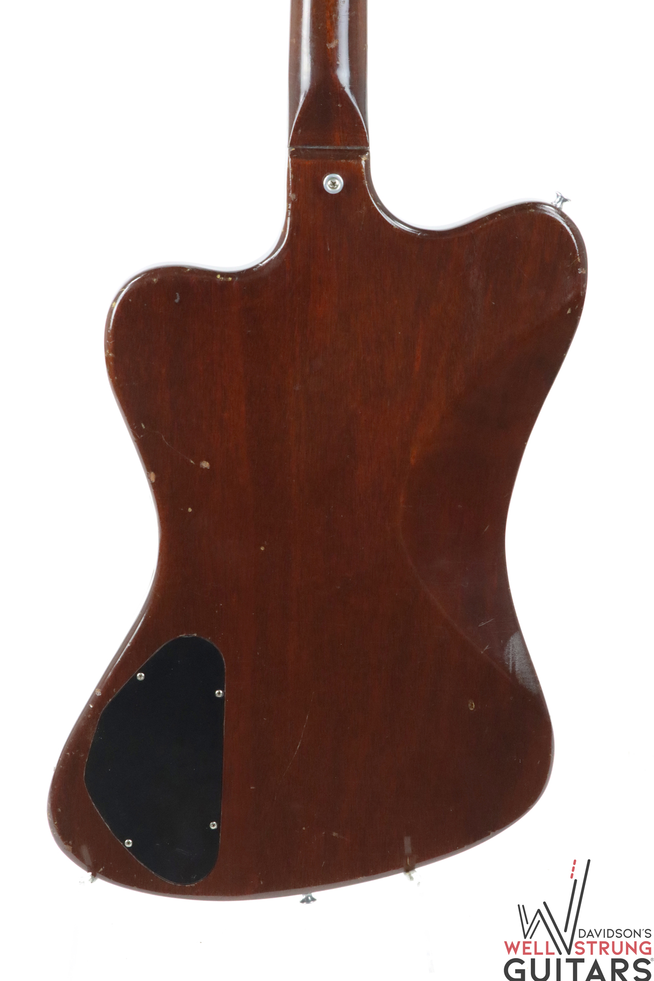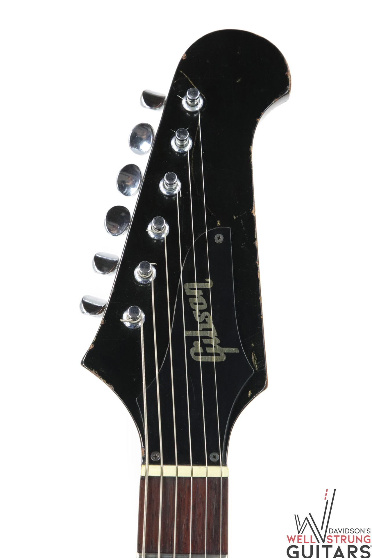 This 1966 Gibson Firebird III in Sunburst is available now! As a Non-Reverse III, it sports a trio of P-90 pickups (all pretty well-balanced), a short Maestro vibrola, and a stairstep bridge. This guitar remains original, with late 1965 pot dates, making it an early 1966 example by serial number. This one has been played in, with plenty of finish checking, nicks, and dings giving it some vibe. There are some light divots in the back of the neck, light staining on the white pickguard around the pickups, and a faded Firebird logo. The coolest feature of this guitar is actually only visible under blacklight! On the lower bass bout, someone applied a sticker or design that looks to be “Love” in script with a heart. While this is no longer visible to the naked eye, you can see the difference in finish once under blacklight. We have included a photo in the listing.