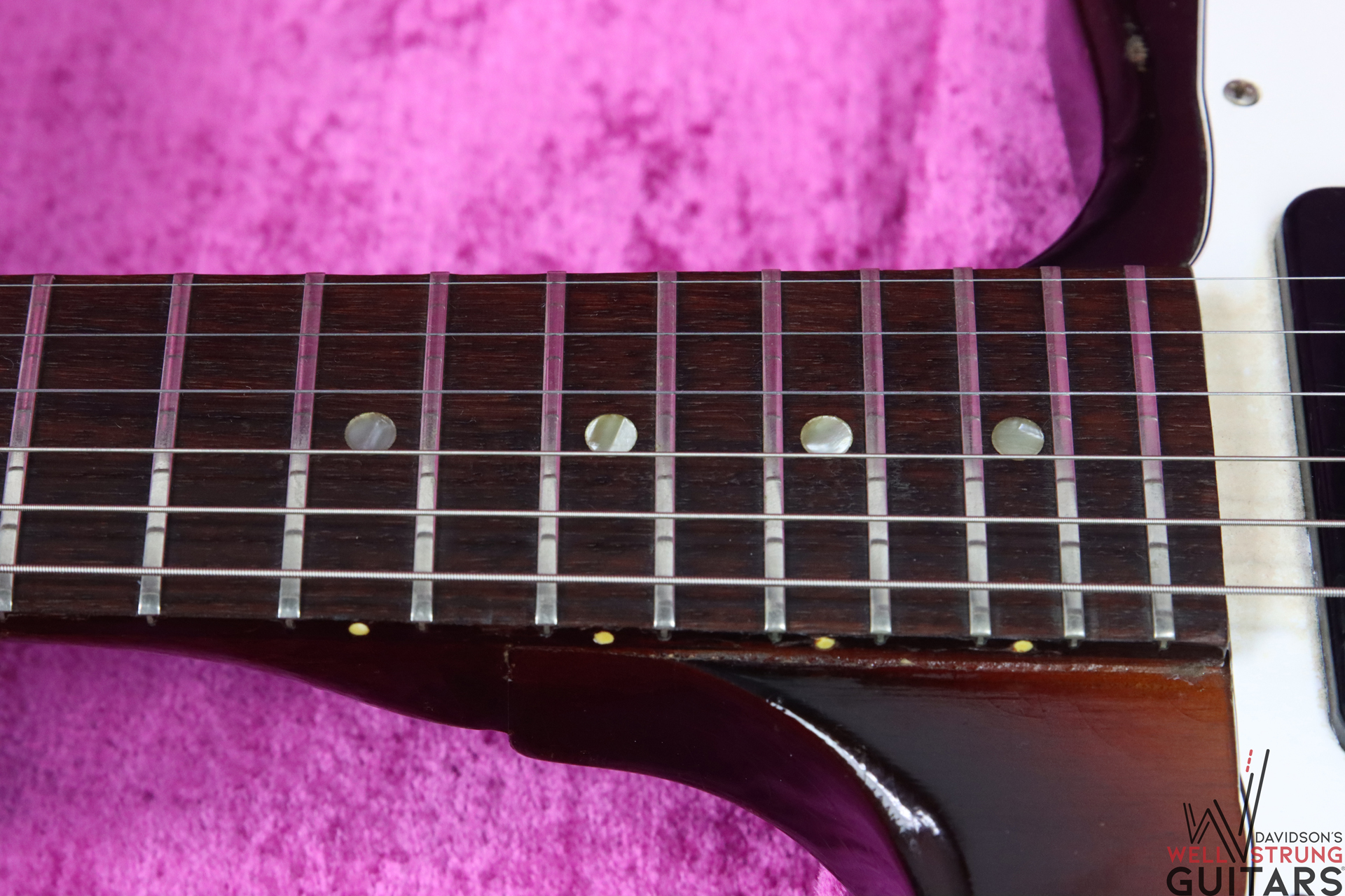 - Finish Details: Sunburst, Original, Fair Condition, playwear, checking, marks throughout guitar