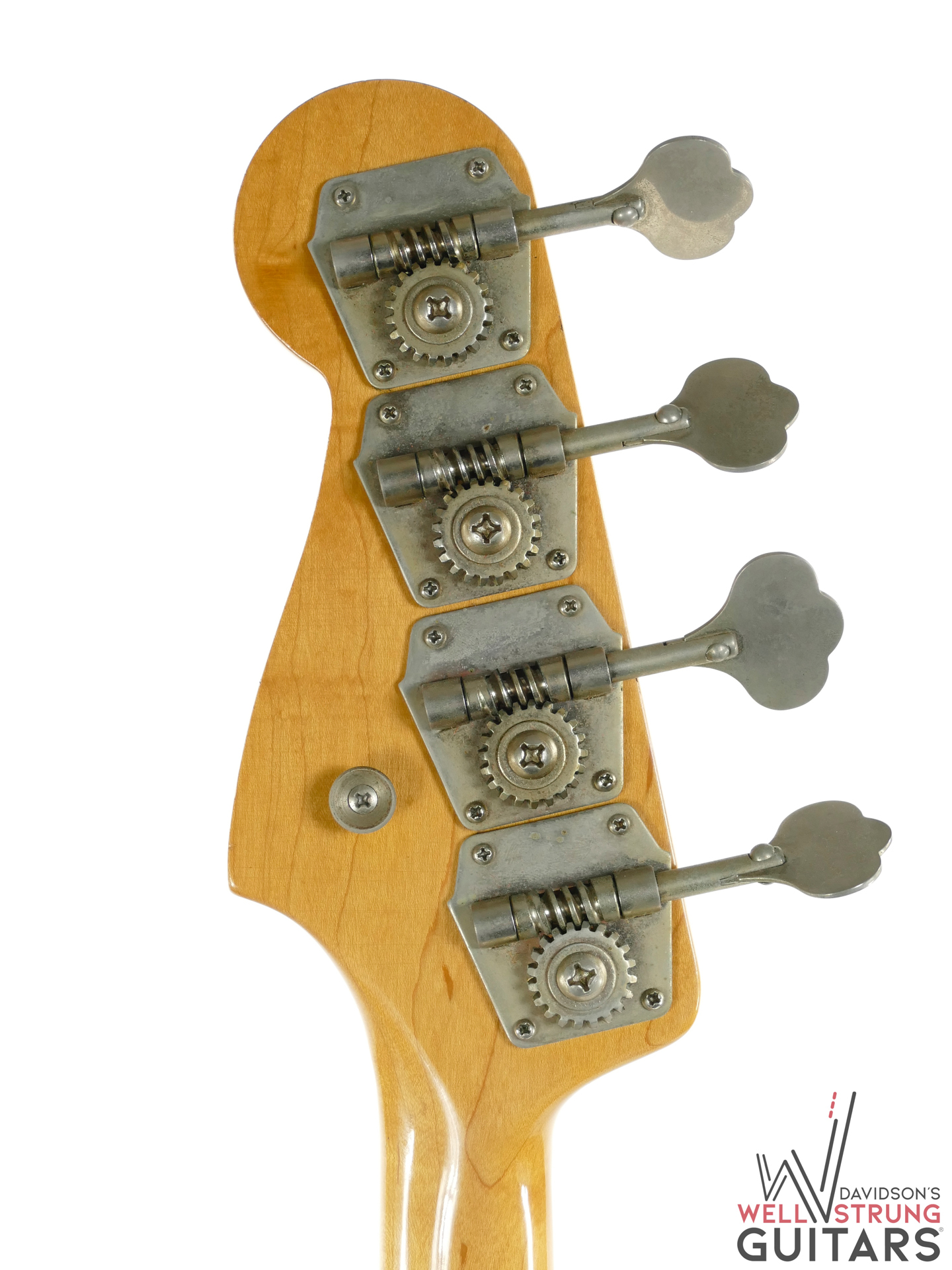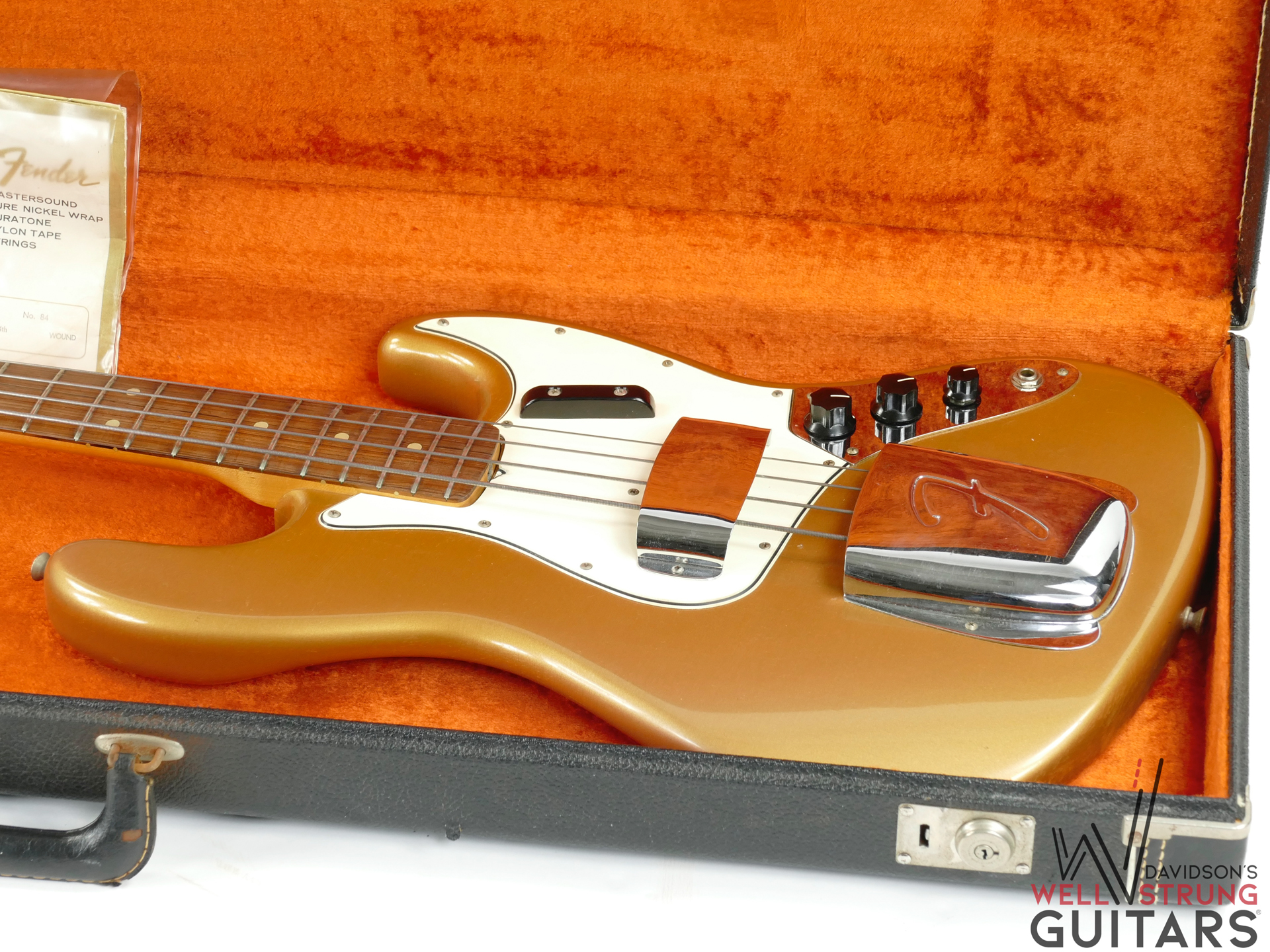 Check out this 1965 Fender Jazz Bass finished in its original custom color Shoreline Gold Metallic! Features of this bass include a matching headstock, rosewood fingerboard, and pearl dot inlays. At some point there was a strap button added to the back of the neck heel, leaving a small hole. It sounds great and all electronics function as intended. Comes with its original hardshell case, strap, and original pack of Fender strings.