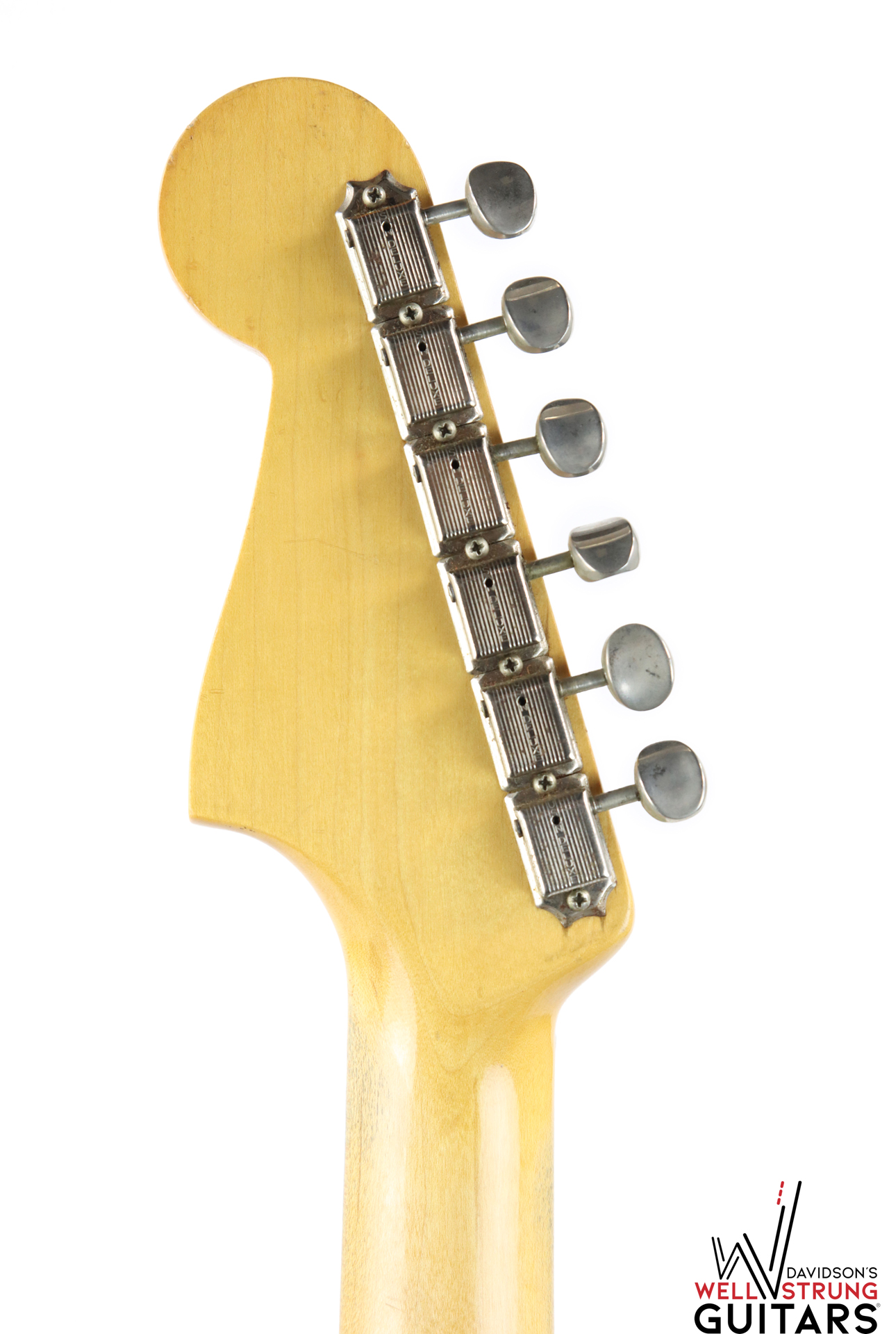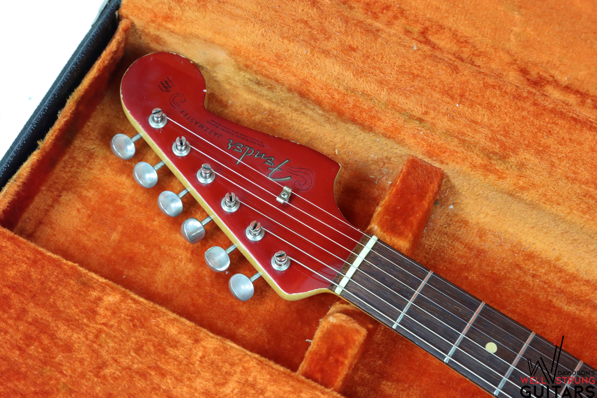 We love the deep shade of the finish on this 1964 Fender Jazzmaster in Candy Apple Red! This example features all the pre-CBS characteristics you’d want, complete with original parts and finish, as well as the original frets and case. The green celluloid guard looks outstanding against Candy Apple Red, and the matching headstock is just the cherry on top. At this point, the undercoat for this finish would still be silver, as evidenced by the arm/edge wear on the bass side of the body. The neck has been played-in, leaving a slick feel that allows you to fly up and down the neck quickly. Overall, this guitar is in good condition, with some minor wear here and there, making it a great candidate for playing out and about.